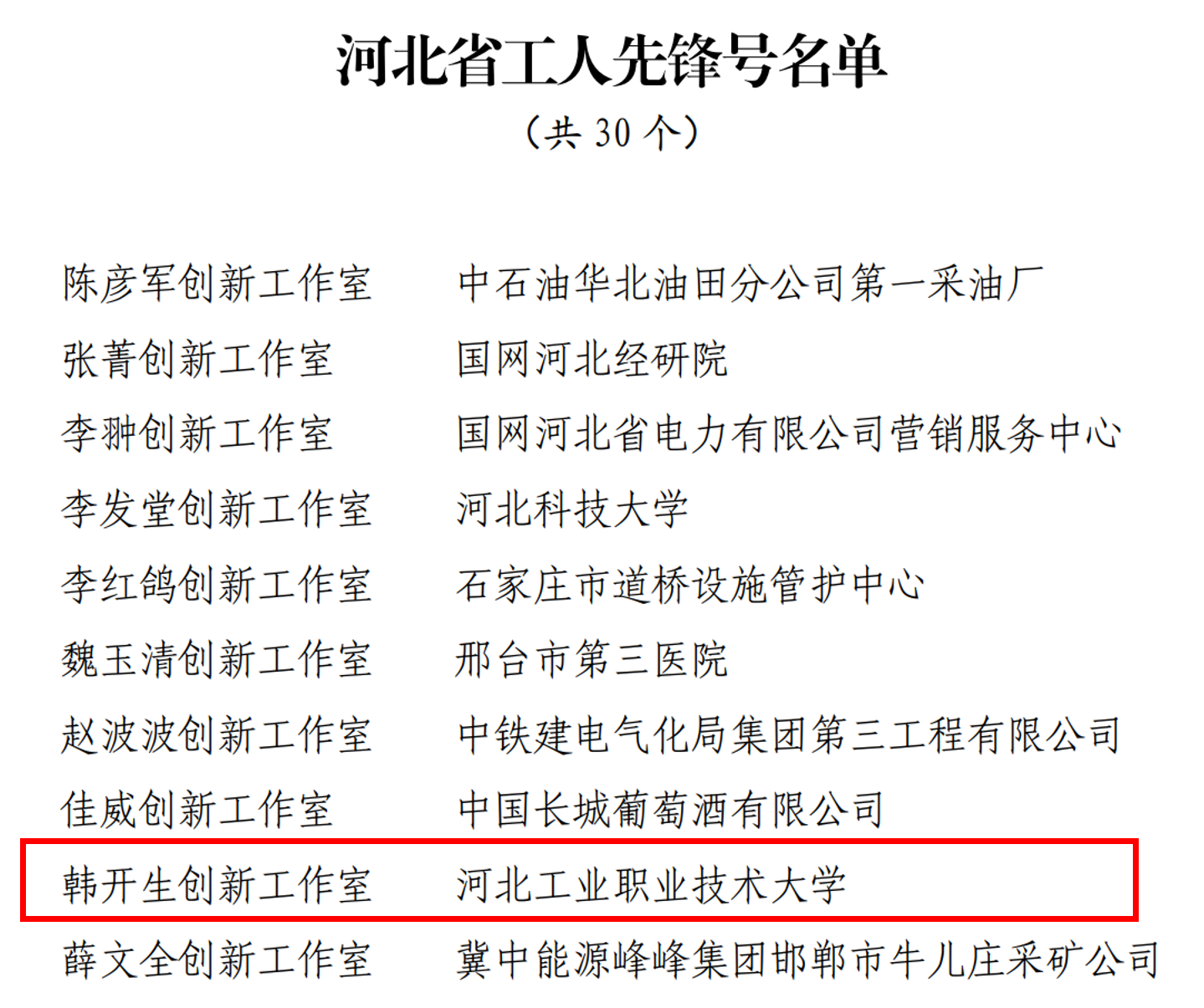 近日,河北省总工会、河北省科学技术厅联合下发了《关于命名第八批河北省劳模和工匠人才创新工作室的决定》,天行在线韩开生创新工作室被命名为第八批河北省级劳模和工匠人才创新工作室,排名第九(共100家)。工作室带头人韩开生副教授由省总工会授予“河北省五一劳动奖章”称号,韩开生创新工作室由省总工会授予“河北省工人先锋号”称号。