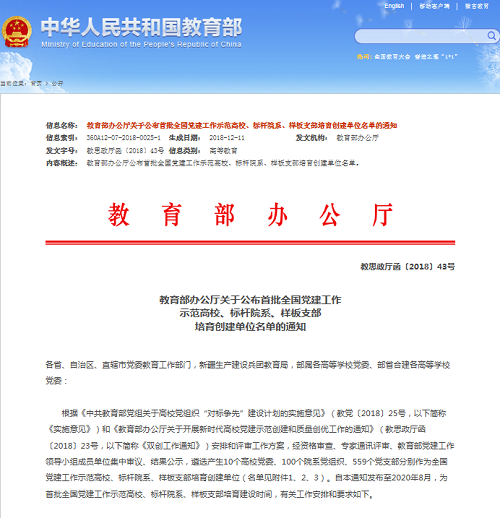 2018年12月10日,教育部办公厅公布了首批全国党建工作示范高校、标杆院系和样板支部培育创建单位名单,遴选产生10个高校党委、100个院系党组织和559个党支部分别作为全国党建工作示范高校、标杆院系、样板党支部培育创建单位。我院工商管理系教师党支部获批成为首批全国党建工作样板党支部。