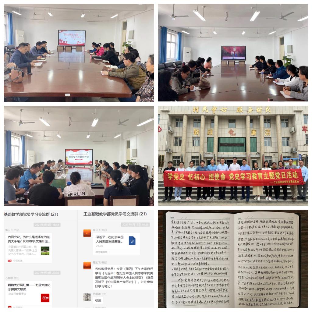 为使党史学习教育既严肃认真又丰富生动,工业基础教学部直属党支部先后组织党员教师开展习近平总书记给平山县西柏坡镇北庄村全体党员的重要回信精神、习近平总书记在党史学习教育动员大会上的讲话精神、习近平《论中国共产党历史》等6次专题集中学习;组织党员教师集中收看了《榜样5》、《建党伟业》、《地道战》等红色影片;召开了党史学习教育、本科职业教育2次主题研讨活动;赴正定县塔元庄开展了“学党史忆初心担使命”党史学习教育主题党日活动。此外,通过微信群、微信公众号等网络媒体向党员教师推送党史学习评论性文章、红色故事;通过“党史学习笔记评比活动”强化党员教师的学习效果。