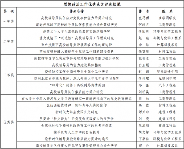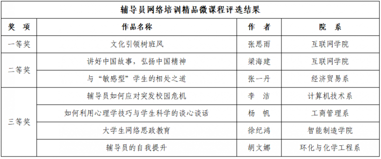 此次作品征集活动,得到学校广大思想政治工作者的积极响应。精品微课程作品以指导和帮助辅导员解决工作中的实际问题为原则,涵盖理论阐释与实践指导,具有针对性和实效性,各课程团队不断锤炼课程,精心设计教学环节,提升课程内涵。思想政治工作论文作品以习近平新时代中国特色社会主义思想为指导,与天行在线思想政治工作实际相结合,在理论框架下创新工作方法和路径,有较强的学术或应用价值。在评审过程中,各环节严格把关,坚持政治底线、学术立场、应用价值、质量为上,做到好中选优。经过自主申报、查重审核、专家盲审等环节,共评选出精品微课程7门、思想政治工作论文20篇,同时择优选取部分作品推荐至省级有关部门。