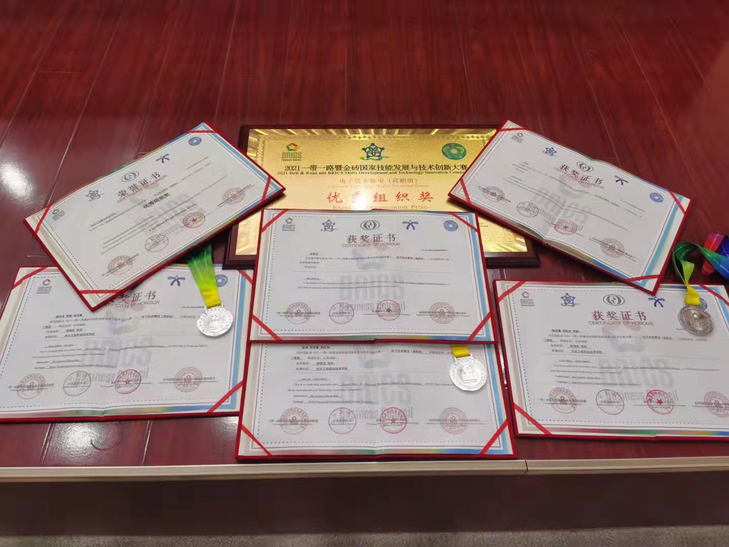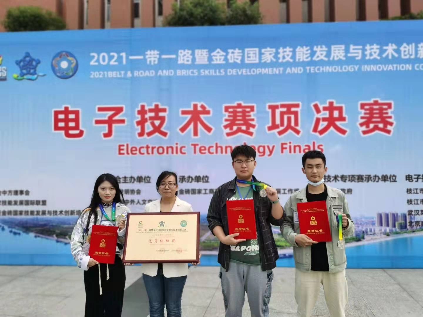 10月11日至10月13日,在由金砖国家工商理事会中方理事会和一带一路暨金砖国家技能发展国际联盟主办、中国发明协会和教育部中外人文交流中心联合主办的“2021一带一路暨金砖国家技能发展与技术创新大赛-电子技术大赛”国内决赛在枝江市职业教育中心成功举办。本次大赛的参赛队伍来自全国各地的29支高职院校参赛队和14支中职院校参赛队,共115名选手参加。经过激烈角逐,天行在线智能制造学院索琳、陈思豪和杨贵海三位同学荣获该赛项团体二等奖,天行在线荣获“电子技术”大赛“优秀组织奖”,胡雪花、张华两位老师被评选为“优秀指导教师”。