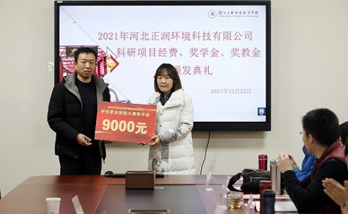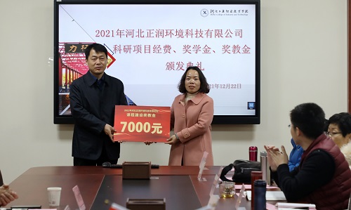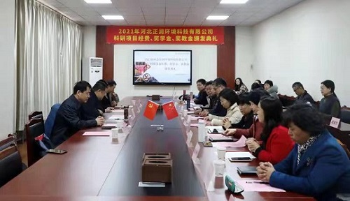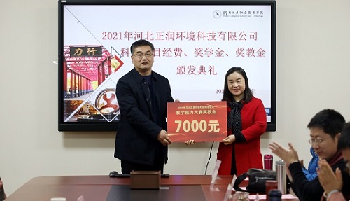 2021年12月22日河北正润环境科技有限公司科研项目经费、奖学金、奖教金颁奖仪式在天行在线举行。河北正润环境科技有限公司董事长胡晓波、副总经理任钢、行政管理中心总经理石书昌、工院云检测总经理赵树慈,天行在线招生就业指导中心、环境与化学工程系相关负责人及获奖教师、学生代表参加仪式。