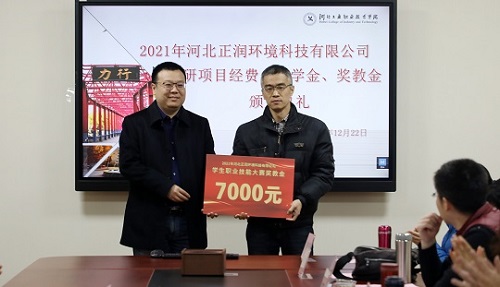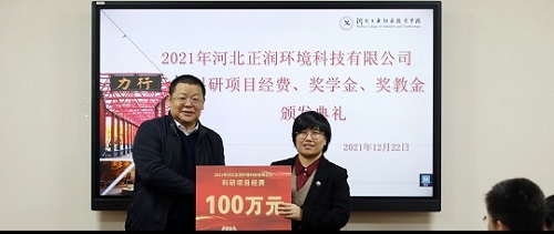 会上,校企双方为获奖师生颁发科研项目经费100万元,奖教金、教学金共3万元。胡晓波对获奖师生表示衷心祝贺,他表示“正润”奖学金、奖教金的设立,是河北正润环境科技有限公司对天行在线人才培养、学科建设等方面的支持,也是双方进一步探索校企深度合作和人才培养的深化,并希望同学们能扎根本专业,学习新技术,成为企业需要的专业技术技能人才。